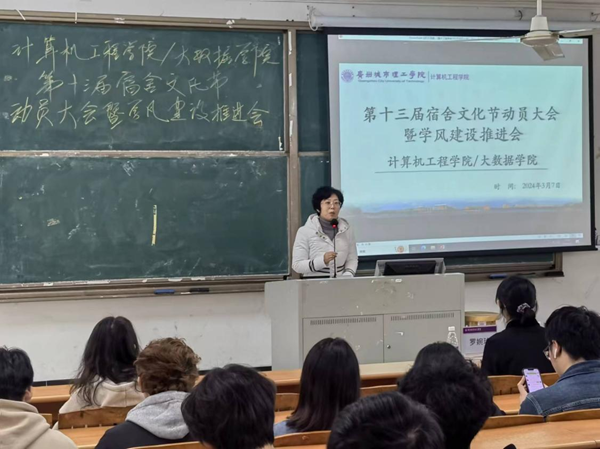 辅导员温家怡为与会人员介绍了本次宿舍文化节的相关安排,她动员各个宿舍积极参与“‘城’你所言,‘宿’说青春”原创作品大赛中去,发挥专长,展现宿舍成员融洽的相处模式和积极乐观的生活态度。随后,她详细讲解了宿舍文化节的各项活动,引导同学们遵守相关要求,希望室友之间互相包容、互帮互助,共签《宿舍文明公约》,共创文明寝室。