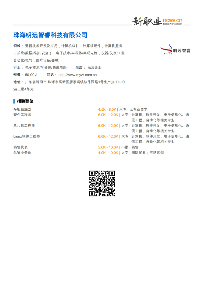 招聘信息 | 珠海明远智睿科技有限公司