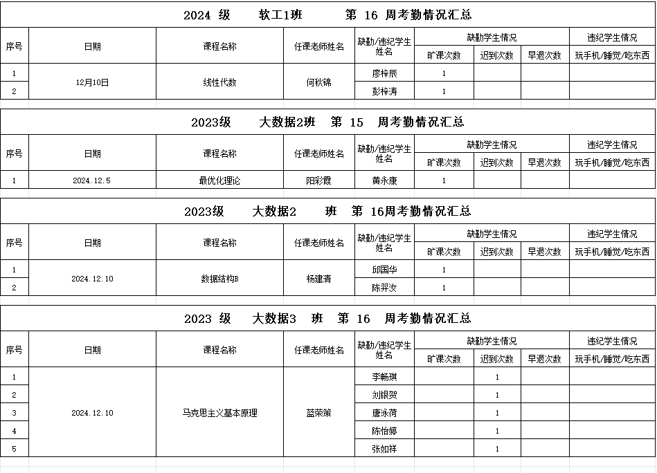 2024-2025学年度第一学期第15-16周员工考勤情况通报