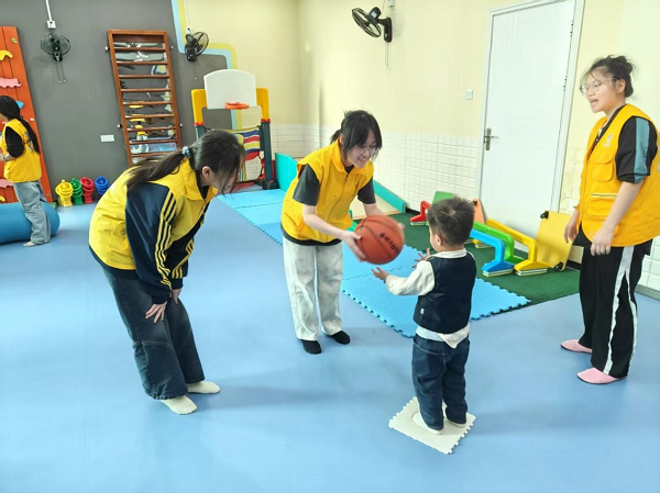 志愿者与儿童进行传接球的协调性锻炼(陈子皓 摄)