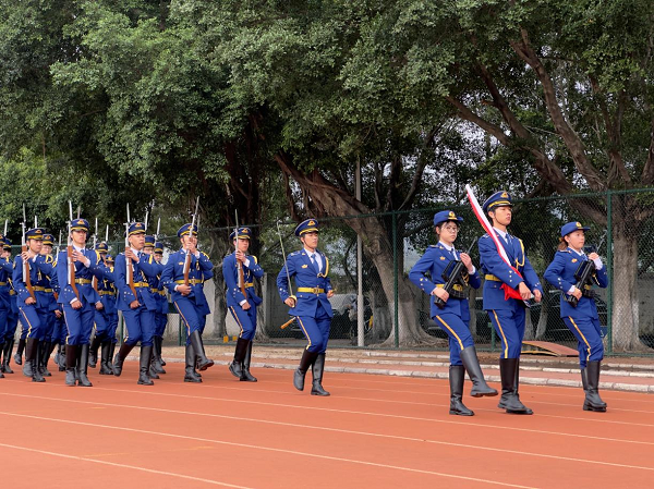 国旗护卫队身着整齐制服,迈着铿锵步伐护卫五星红旗入场。伴随激昂的国歌声,全体师生庄严肃立,行注目礼。五星红旗冉冉升起,在晨光中,传递着师生对祖国的热爱与敬意。