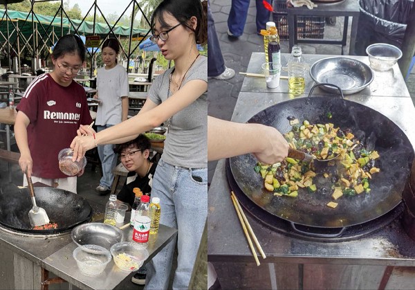 午间的野炊环节成为检验实践能力的第二课堂。各小组围绕有限的食材与调味料迅速分工,清洗和处理食材、烹饪和设计菜单,大家有序配合。从未下过厨同学也在队友指导下完成了自己的第一道炒菜。炊烟袅袅中,各部门同学分享家乡故事,笑声与锅铲声交织成特别的青春记忆。刘杨丰硕同学感慨道:“这次活动让我们在烟火气中学会沟通互补,野炊不仅考验动手能力,更让大家在分工协作中深化信任。”