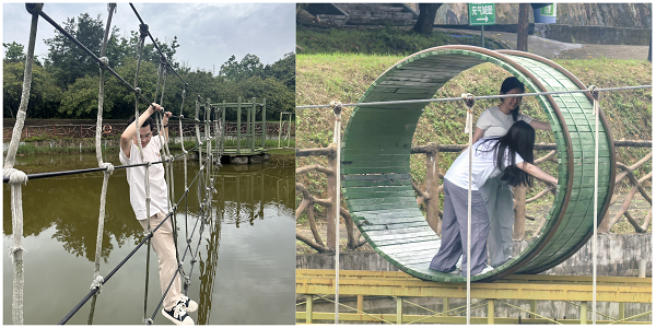 活动以“重走长征路”情景模拟拉开序幕。首项“水上闯关”迅速点燃团队热情。员工干部通过浮桥、攀爬网等障碍时需合作解答党史问题,既考验体力又检验知识储备。在“飞夺泸定桥”模拟项目中,员工干部需要使用有限的木板,完成桥梁的搭建。大家商讨策略,分组拿取木板,调整木板的位置和角度,确保桥梁稳固,最终实现全员安全通行。员工会主席团成员陈杨柳表示:“这些项目让我们真切体会到革命先辈的智慧与勇气。”