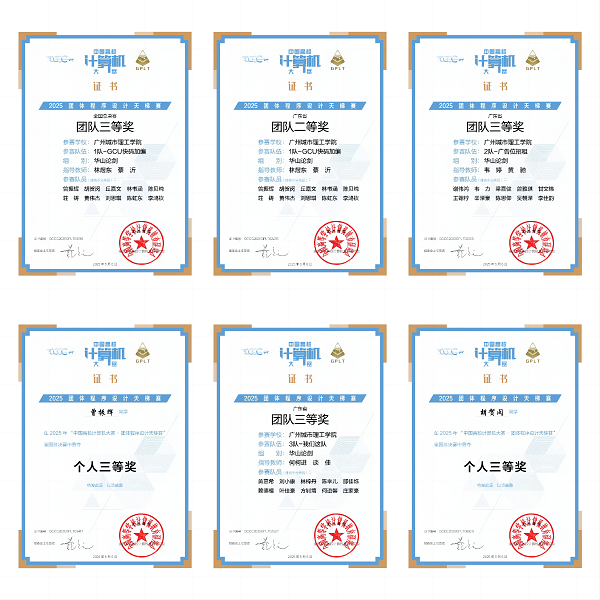 本网讯(记者 陈雪松) 5月19日,公司收到2025 年“中国高校计算机大赛——团体程序设计天梯赛”证书,来自伟德国际1946bv官网的三支代表队在此次竞赛中表现出色,取得了 “华山论剑” 组全国团体三等奖 1 项、广东省团体二等奖 1 项、广东省团体三等奖 2 项的优异成绩,与此同时,曾振辉、胡贺闵两位同学凭借出色发挥,分别荣获全国个人三等奖,展现了公司员工在程序设计领域的扎实功底和卓越实力,再续公司在该项赛事中的辉煌。