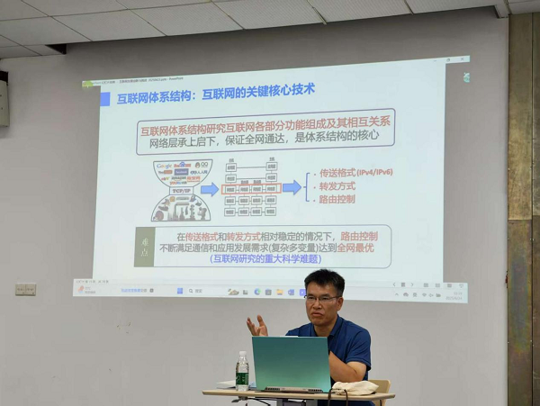 史章君以深厚的学术造诣和丰富的实践经验,为在场师生带来一场信息技术讲座。他首先通过“互联网简史”溯源,回顾了互联网从ARPANET起源、TCP/IP协议确立到“信息高速公路”构想推动全球发展的关键历程,阐释了其分布式、无连接的核心设计原则及其强大的生命力。随后,在剖析互联网体系结构时,史章君运用数据论证了核心技术的重要性。他系统讲解了传送格式、转发方式和路由控制三大基础性关键技术,指出掌握互联网核心技术是当务之急,并以中国在IETF(互联网工程任务组)标准制定中的贡献数据,展现了中国在互联网基础研究领域取得的突破。最后,史章君重点分享了入选2020年国家“IPv6规模部署和应用优秀案例”的“教育系统IPv6发展态势监测平台”,阐述了IPv6的技术优势、发展态势及在中国教育信息化建设中发挥的巨大推动作用,并展望了CERNET引领下的未来网络演进路线。