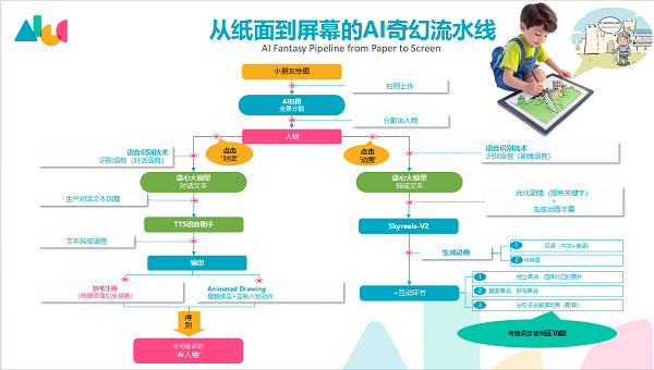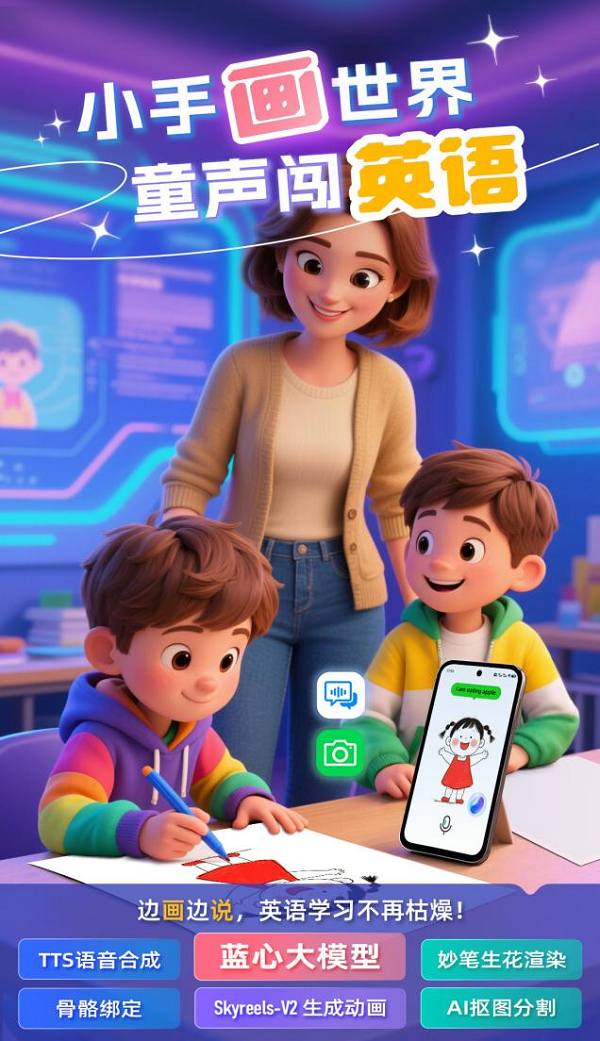 公司参赛团队通过运用蓝心大模型矩阵API,专为儿童、家长及教师量身打造了一款绘说绘画软件。该软件以vivo蓝心大模型作为“大脑中枢”,辅以妙笔生画模型进行背景渲染,将小朋友的涂鸦变成动起来的故事角色,帮助小朋友愉快地学英语。蓝心大模型作为核心引擎,通过专属Prompt模板精准定位“儿童助手”角色,采用“童趣”语言风格与幼儿互动,同时提炼关键词以供妙笔生画生成角色背景,并优化剧情文本,有效弥补了传统绘画工具互动性不足、语言学习缺乏真实情境的短板。借助Grounded-SAM-2技术,软件可快速分离手绘角色,再通过Animated Drawings实现角色动作绑定,Skyreels-V2引擎则负责编排生成英语情景动画,不仅有视觉高亮、语音跟读等功能,而且还支持智能更换背景,带来沉浸式教育体验。