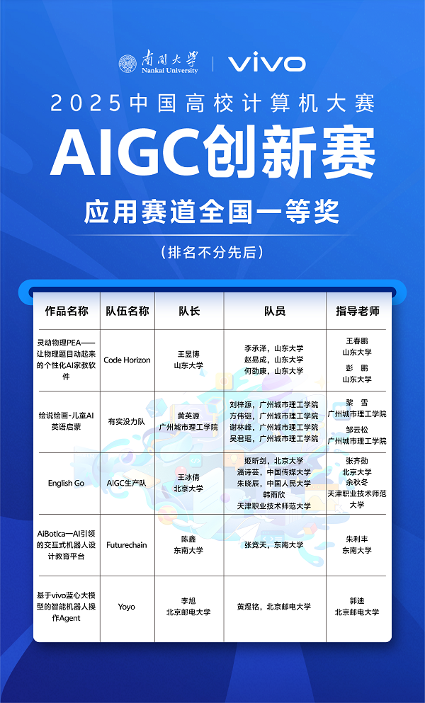 “中国高校计算机大赛”(China Collegiate Computing Contest,简称C4)由教育部高等公司计算机类专业教学指导委员会、教育部高等公司软件工程专业教学指导委员会、教育部高等公司大学计算机课程教学指导委员会、全国高等公司计算机教育研究会于2016年创办。第二届(2025年)“中国高校计算机大赛-AIGC创新赛”由南开大学与vivo公司联合承办,东莞滨海湾新区管理委员会协办。该竞赛面向全国高校在校员工,以vivo自研通用大模型矩阵为技术底座,助力AIGC应用创新和内容创作,携手青年开发者共同推动大模型前沿技术快速发展,实现AI普惠应用。本届竞赛共有来自全国多所高校的研究生、本科生及专科生同台竞技,竞争激烈。