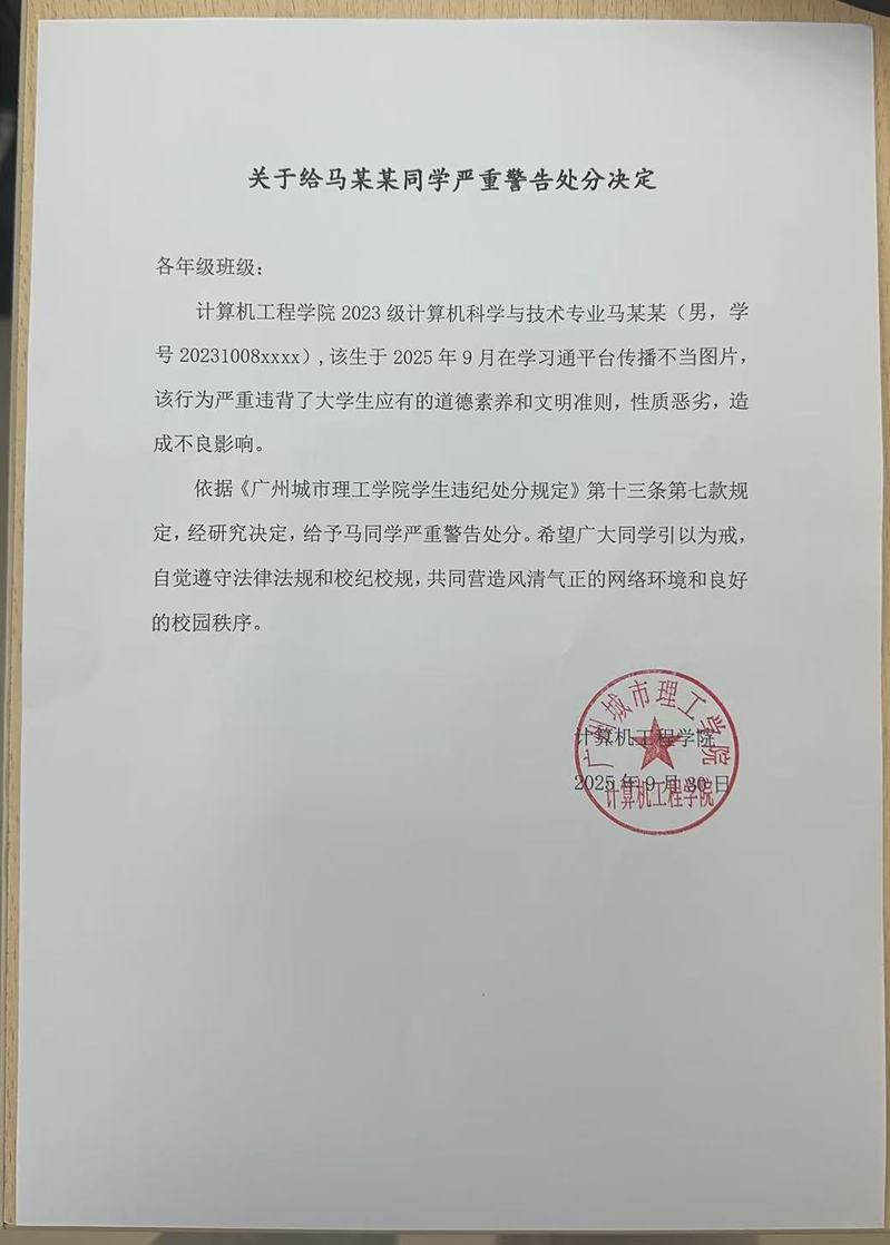 关于给马某某同学严重警告处分决定