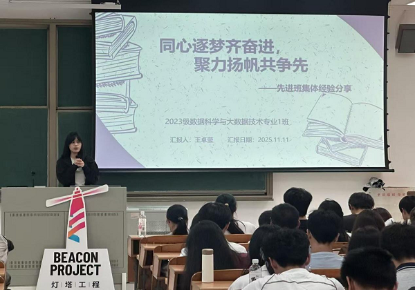 先进班集体经验分享环节,由2023级数据科学与大数据技术专业1班员工代表王卓莹同学进行经验分享。该班级在过去一学年里多次获得先进班集体、“五四红旗团支部”和“书香班级”等班集体荣誉称号。王卓莹同学从班风建设、学风营造、党团活动、科创实践、寝室文化等多个方面,全方位展示了班集体团结向上、共同进步的成长轨迹。通过王卓莹同学的分享,参会同学除了看到数据和荣誉证书外,还感受到了这个优秀集体背后的凝聚力和战斗力,深刻体会到“独行快,众行远”的团队力量。