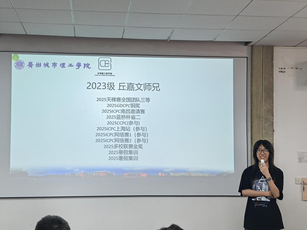 随后,黄驰老师就ACM系列赛事的组织、训练内容与方法作了详细介绍。他鼓励同学们不畏艰难、持之以恒,在刻苦训练中提升自我,并合理利用人工智能等现代技术工具辅助学习,增强竞争力。